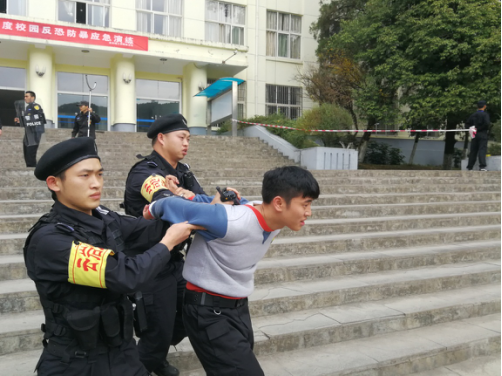 当天中午11时,2名手执砍刀的“暴恐分子”在我校采矿楼至第二教学楼路段伺机作案,被治安三号岗值守人员发现,及时向保卫处报告。保卫处人员闻讯后,迅速调集校园应急处置队员携带安保装备,赶赴现场进行处置。到达现场后,保安队员成功将2名“暴恐分子”控制在第二教学楼门前。经过十余分钟的搏斗,成功将2人制服,随后交辖区派出所民警带走。