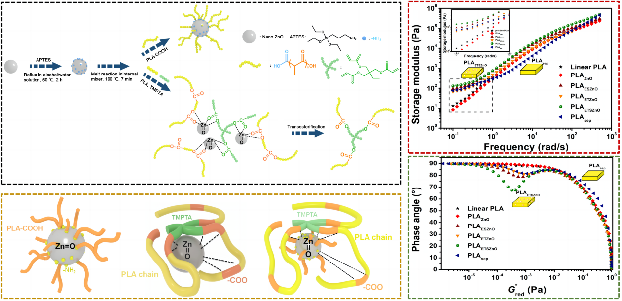 在PLA的线形分子链中引入长链支化结构,制备成长链支化聚乳酸(LCBPLA)是解决这一问题的有效手段。本研究从抑制PLA的降解反应,同时促进其支化反应这个着眼点出发,采用氨基修饰的Nano-ZnO代替单一的Nano-ZnO作为促进剂添加到PLA与多官能酯的反应体系中,在不影响其配位能力的前提下,Nano-ZnO表面的氨基能与因配位诱导酯基断裂、PLA降解产生的端羧基发生酰胺化反应,减少体系端羧基,及时捕捉PLA降解链,形成以Nano-ZnO为中心的LCBPLA,体系中同时存在以Nano-ZnO为中心的LCBPLA和以多官能酯为中心的两种支化结构的LCBPLA,使PLA的熔体强度和熔体应变硬化效应大幅提高,能适应连续挤出发泡等大应变加工方式。该研究能为高效环保和绿色循环的LCBPLA制备提供理论指导,完善制备LCBPLA的理论体系,为实现食品包装领域低成本、低污染、低能耗的PLA高性能化提供理论依据。