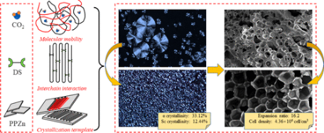控制材料的可发性是制备高性能聚乳酸(PLA)泡沫的关键。为了达到这一目的,通常使用扩链来改善PLA树脂的流变性能;然而,尽管这种方法可用,但它通常会对PLA的生物降解性产生负面影响,并大大增加加工成本和复杂性。因此,我们报道了一种特殊的结晶诱导方法来设计具有可调节的发泡结构和高膨胀率的PLA泡沫。一种新的结晶促进剂组合(D-山梨醇、超临界CO2和苯基膦酸锌盐)用于诱导PLA,以增强链相互作用力和链活动能力,并提供结晶模板。获得了一系列结晶度可调的立体络合物(Sc)/α和快速非等温结晶能力的PLA。研究了不同结晶性能对PLA发泡行为的影响。结果表明,合适的结晶条件(球晶尺寸小、结晶度6%和快速结晶能力)有助于优化泡孔结构,最高泡孔密度达到4.36×106 cell/cm3。当Sc结晶度高于10%时,PLA具有优异的发泡性能,可获得16.2的高发泡膨胀率。通过改变发泡温度和结晶性能,还可以获得多种形态的PLA泡沫。本研究所提出的结晶诱导方法为控制PLA泡沫的泡孔结构和性能提供了一种有用的方法。