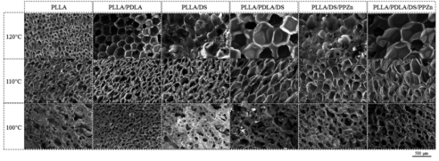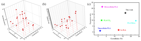 课题组通过超临界CO2发泡成型工艺,研究了不同多晶性能的PLA发泡形态特征。研究发现表明Sc结晶度有利于改善材料的可发性,而不需要传统的扩链剂,同时结晶温度与发泡温度的配合能够实现PLA泡孔形态的演变。由此可以获得不含交联体系的PLA发泡材料。