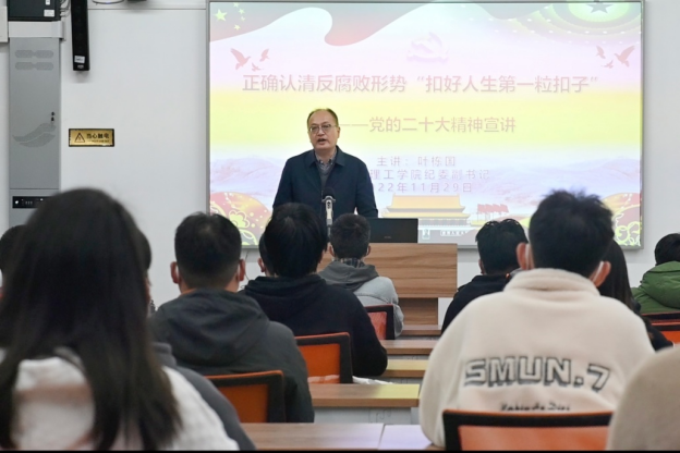 本网讯(大数据学院)11月29日晚,大数据学院“一院一品”之廉洁文化讲座在贵安校区知行楼G3302教室举行。贵州理工学院纪委副书记叶栋国应邀以“正确认清反腐败形势 扣好人生第一粒扣子”为题宣讲党的二十大精神。讲座由党总支书记张艳主持,党总支副书记武斌、学生党员代表和部分2023届毕业生参加讲座。
