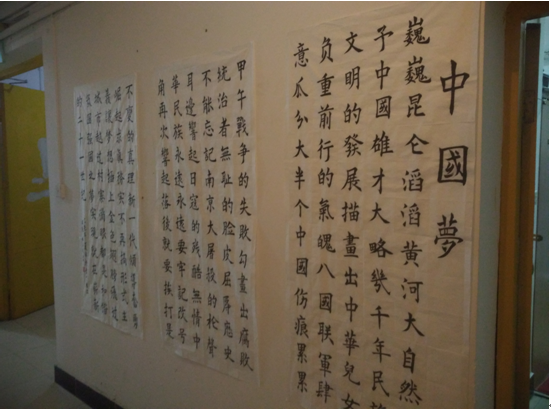 我院男生寝室的同学发挥了各自的特长,有的同学画了许多可爱的小动物,有的同学提倡环保,用废弃物品做出了一幅画,其中最吸引人色的是墙上一幅幅刚劲有力的毛笔字,走过这面墙,可以感受到来自文字内敛纯朴的气息,可以感受到中国传统文化的博大精深。