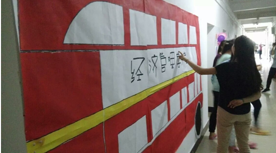 我院女生寝室也不甘示弱,一走进楼道,就看到一面色彩鲜明的标语墙,写着"经管起航,梦想飞扬",标语的周围还有许多色彩斑斓的手掌印,似我们梦想那般鲜明而热烈。除此之外,楼道的两边还贴了各色各样的照片,书写了我们肆意的青春。走进这段楼道,就像走进了一片梦幻的街道,在街尾可以看到一辆红色公车,它带上了我们绚丽的梦想在未来的路上飞逝。