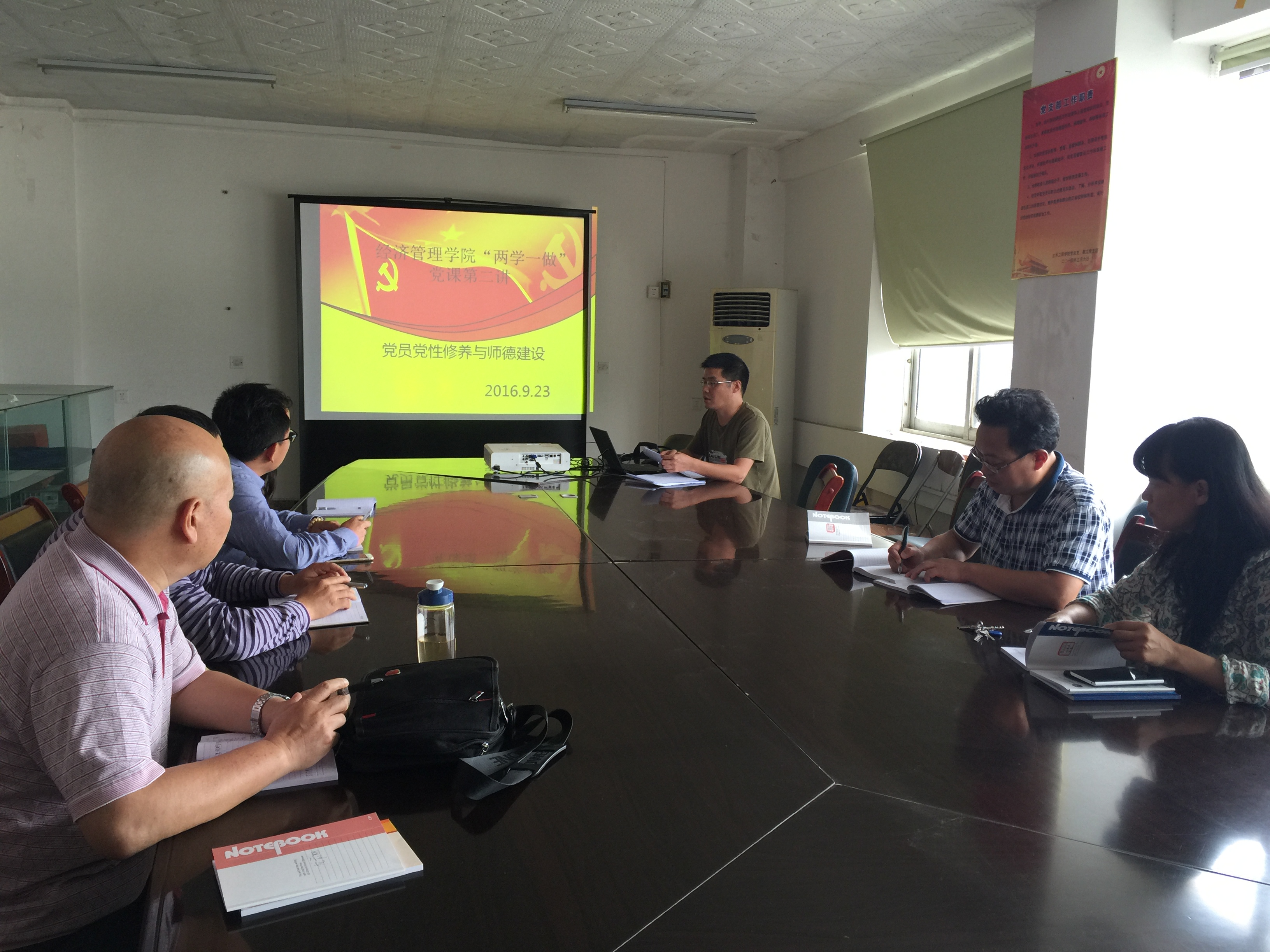 2016年9月23日,经济管理学院全体党员共聚1229会议室,学院教工党支部书记刘宏为全体党员进行“两学一做”学习教育专题党课讲座第二讲,主题为“党员党性修养与师德建设”。