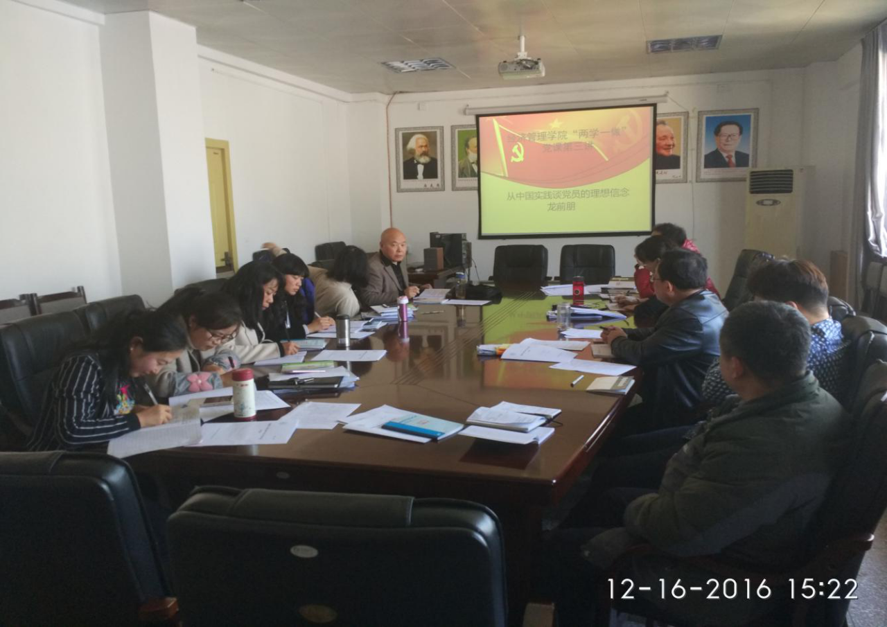 2016年12月16日,经济管理学院“两学一做”学习教育专题党课第三讲在综合楼1229室开讲,主题为“从中国实践谈党员的理想信念”,主讲人是我院国家社科基金获得者龙前朋老师,学院全体党员聆听讲座。