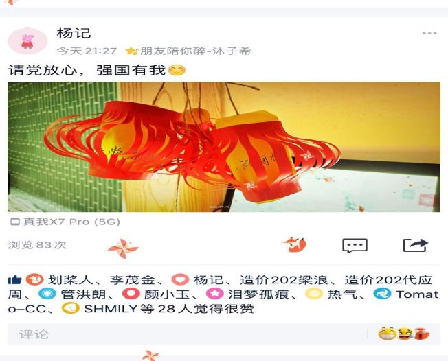 团支部书记彭鹭扬同学领学了习近平总书记“七一”重要讲话精神,和同学们一起回顾中国共产党百年奋斗的光辉历程。并组织同学们进行英雄人物竞猜活动,带领同学们学习英雄的先进事迹。在花灯寄心愿环节,同学们制作了精美的花灯,在花灯上写下对祖国的深情祝福。