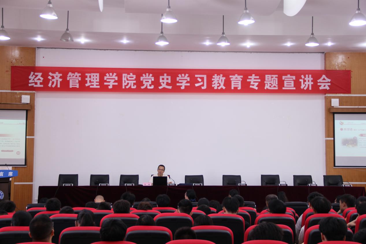 本网讯(经济管理学院 胡薇/文图)9月24日,经济管理学院在喀斯特报告厅举办党史学习教育专题宣讲会,开展学习贯彻习近平总书记“七一”重要讲话精神专题宣讲。学校党史学习教育教师宣讲团成员、马克思主义学院综合教研室负责人张璋副教授应邀担任主讲。学院领导杨雁、李静、方燕出席,学院师生代表140余人参加并聆听,党总支书记杨雁主持宣讲会。