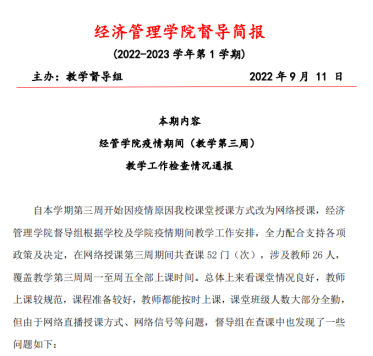 为保证线上教学效果,学院组织教学督导组对线上教学、学生课堂表现及出勤率等进行监督检查,并撰写督导总结和简报,共同促进教学质量提升。当前,督导组共查课92班(次),涉及教师43人次。