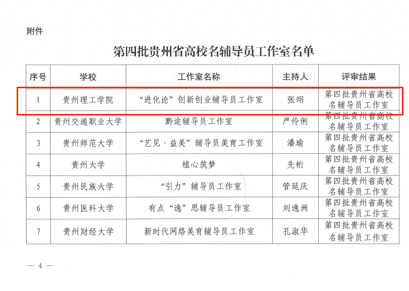 近日,省委教育工委、省教育厅公布第四批贵州省高校名辅导员工作室评选结果,我院学生科副科长张翊老师主持的“进化论”创新创业辅导员工作室位列第一,作为第四批贵州省高校名辅导员工作室。