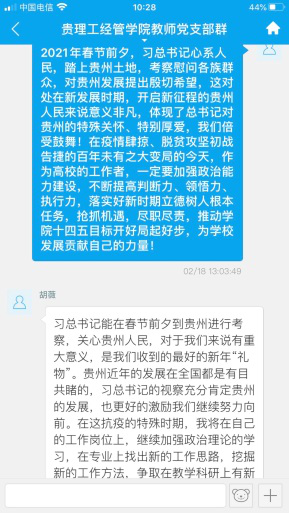 2021年2月18日,经济管理学院组织教师线上学习2月3日-5日习近平总书记视察贵州重要讲话精神,并通过易班发表学习体会。