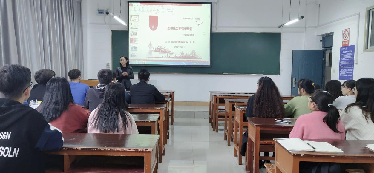 本网讯(文图/蔡兴荟)2021年11月5日,经济管理学院党总支书记杨雁在3教107为党校第十一期发展对象讲授党课,学生党支部书记白桂霞参加党课。