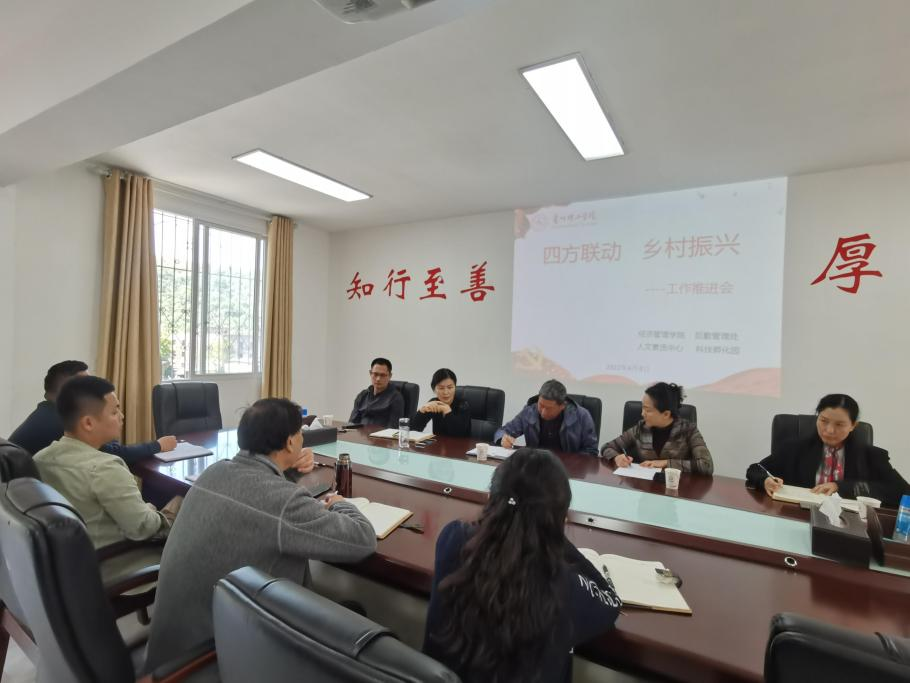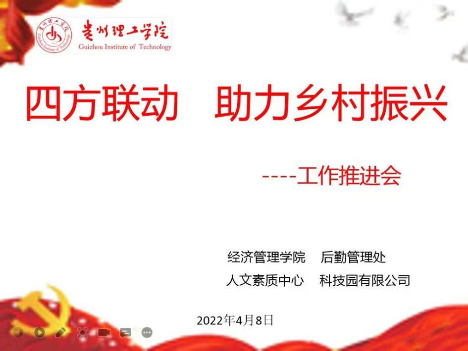 本网讯(经济管理学院 张翊/文图)2022年4月8日,经济管理学院、后勤管理处、人文素质教育中心、贵州理工科技园发展有限公司在后勤管理处会议室召开助力乡村振兴工作推进会。后勤管理处党总支书记周红、处长卢文雄,经济管理学院党总支书记杨雁、院长杨岗营、党总支副书记方燕,人文素质教育中心主任刘琦,贵州理工科技园发展有限公司董事长刘朝出席会议。