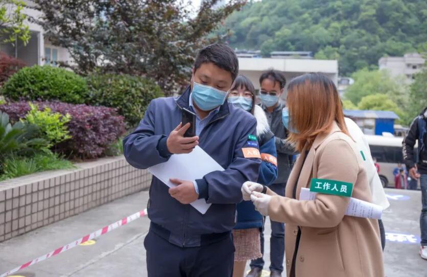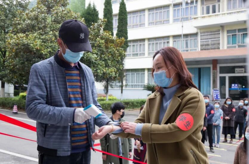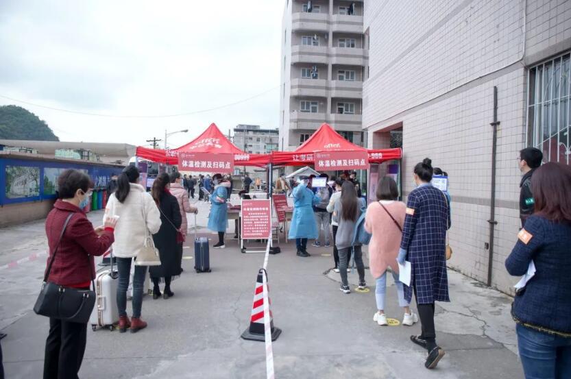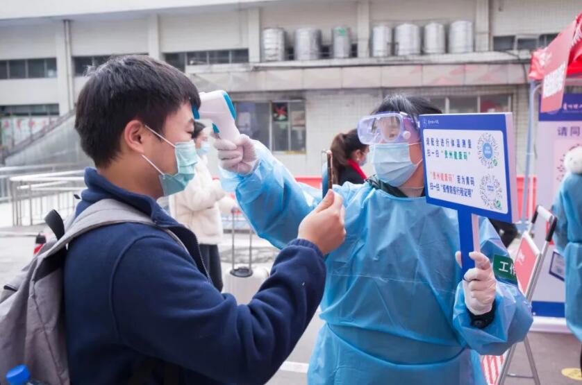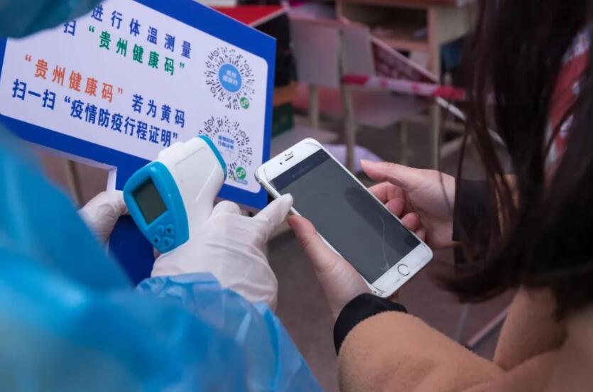 体温检测人员依次对排队人员进行体温检测,并查看“贵州健康码”、“国务院客户端-防疫行程卡”扫描结果。