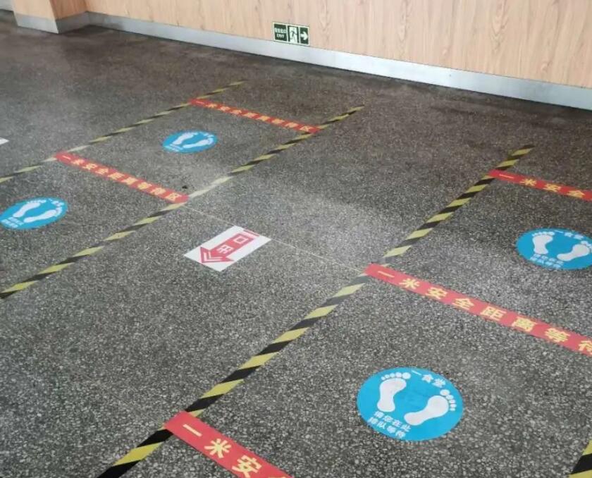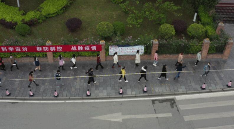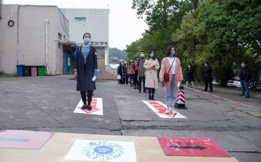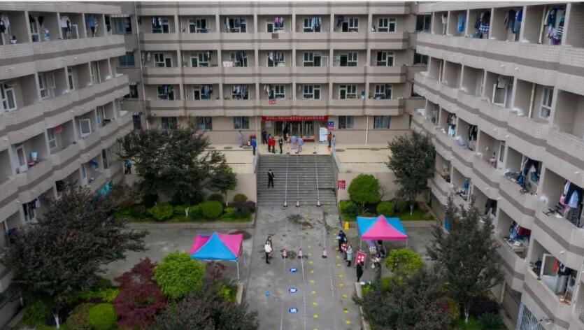 学生进入宿舍楼排队区域,根据引流标识排成左右两队等候检测。