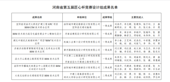 2022年11月30日,贵州省交通规划勘察设计研究院股份有限公司、贵州理工学院联合完成的“”焦作至平顶山高速公路焦作至荣阳段黄河特大桥南水北调主桥BIM设计应用”项目,荣获2022年河南省第五届“匠心杯”工程建设BIM技术应用大赛设计组二等成果奖。