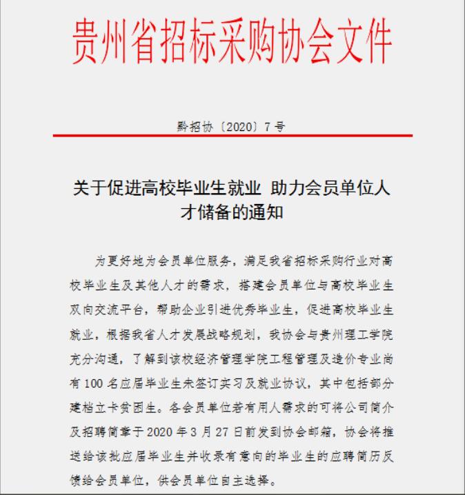 该协会拥有400余家会员单位,双方经过充分沟通,省招投标协会对我院2020届毕业生工作就业给予大力帮扶和支持。在3月18日向会员单位下发《关于促进高校毕业生就业助力会员单位人才储备的通知》(黔招协〔2020〕7号)文件,通知有用人需求的会员单位向我院毕业生提供公司简介和招聘简章。在3月27日后,将有意向的毕业生应聘简历推荐给会员单位,通过线上交流后,进行双向自主选择。