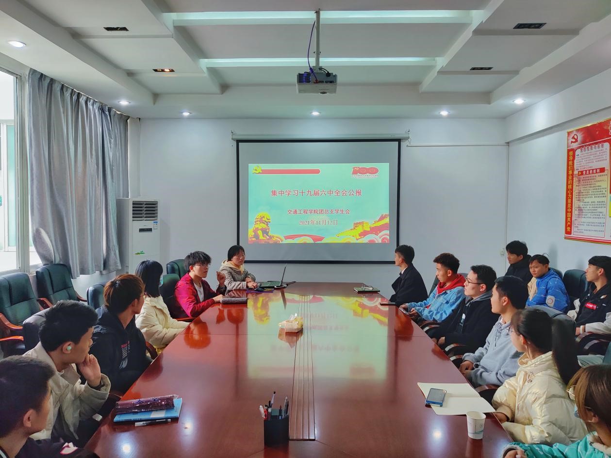 (本网讯交通工程学院图/王港 文/杨银凤)十九届六中全会是在中国共产党成立一百年的重要历史时刻召开的一次具有重大历史意义的会议。为进一步坚定青年学子对党的信仰,紧跟党的步伐,在新时代赶考路上奉献青春力量,2021年11月12日,交通工程学院团总支、学生会青年学生干部在院团总支书记苏利荣的带领下对十九届六中全会公报开展深入学习并集中观看十九届六中全会新闻发布会。