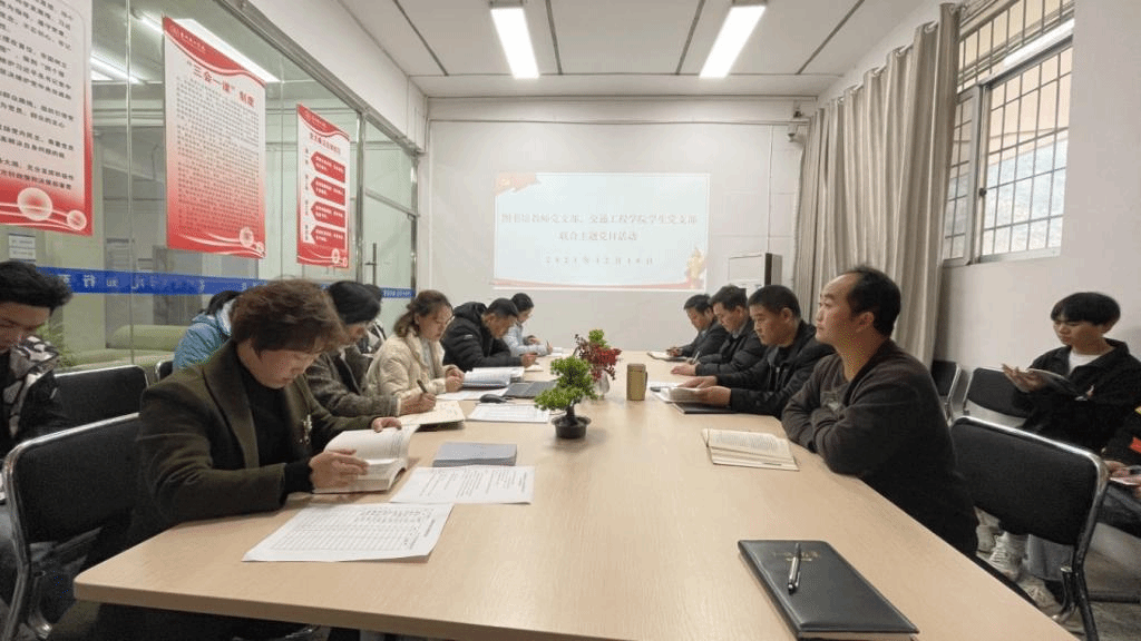 (本网讯黄毅丹/文 张廉/图)为引导广大师生党员深读研学十九届六中全会《决议》,进一步坚持唯物史观和正确党史观,深刻认识中国共产党百年奋斗的历史意义,从党的百年奋斗中汲取精神力量,更加坚定、更加自觉地践行初心使命,2021年12月10日中午,图书馆教师党支部与交通工程学院学生党支部在图书馆一楼研讨室联合开展“学习贯彻党的十九届六中全会精神——马克思主义中国化的‘三次飞跃’”主题党日活动。