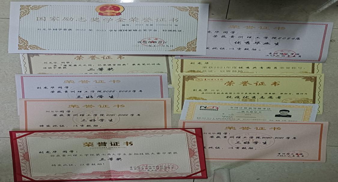 每当同学们提起刘龙华时,总会想到他学习成绩好,品性好等,被大多数人当作学习榜样。他从不旷课,不迟到早退,在课上认真听讲,细做笔记,回答问题积极,多次受到任课老师的表扬,被同学们公认为学习标兵。大学四年专业平均绩点排名第三,综合成绩排名第四,班级第二。期间获得过国家励志奖学金,三好学生,优秀共青团员,优秀志愿者,校级优秀毕业生,省级优秀毕业生等称号。当有人问他怎么学习时,他会说每个学期会给自己制订一个学习计划,并且把学习任务划分为每个阶段,根据各科难度分配学习时间,保质保量完成每一次学习任务。在应对每一次考试或者实验,他都能出色的完成任务,取得优异的成绩。