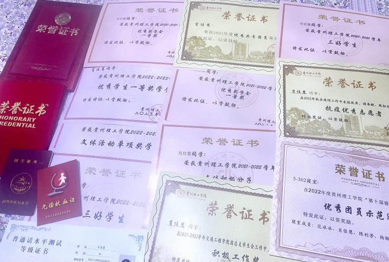 夯实专业,孜孜以求。2020年9月她踏入了彩虹门,成为了交通工程学院的2020级的一名新生。她作为一名学生,在专业学习上孜孜以求,在大学的时间里,她始终保持着认真努力的学习态度,课堂上她聚精会神地听讲,紧跟老师的教学节奏;课后,她勤于思考,深入钻研,不断拓展自己的视野。在专业课程的学习中,她擅长寻找方法,充分利用时间,提高学习效率。她还努力拓宽自己的知识面,广泛涉猎各类学科,并考取了普通话口语考试的二级甲等证书和全国英语四级考试的证书以及健美操初级教练证。认真对待每一次课堂与作业,三年学业成绩与综合测评位居专业前列,连续三年获得校一等奖学金以及文体活动单项奖学金,还获得省级优秀毕业生、校优秀毕业生、校三好学生、优秀共青团员、文体积极分子等荣誉称号。