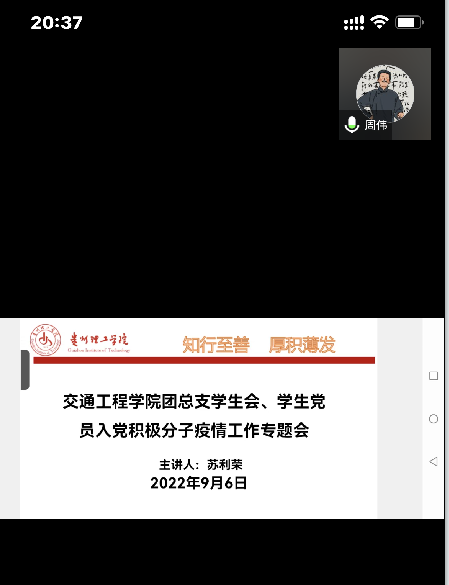 本网讯(交通工程学院 图文/苏利荣)贵阳疫情来势汹汹,目前形势非常严峻,为有效应对疫情,配合学校相关部门做好疫情防控工作,交通工程学院团总支学生会召开线上疫情防控专题会,主题部署近期疫情防控工作安排,团总支学生会全体学生干部、入党积极分子、学生预备党员、党员参加,交通学院党总支副书记周伟出席,会议由团总支书记苏利荣主持。