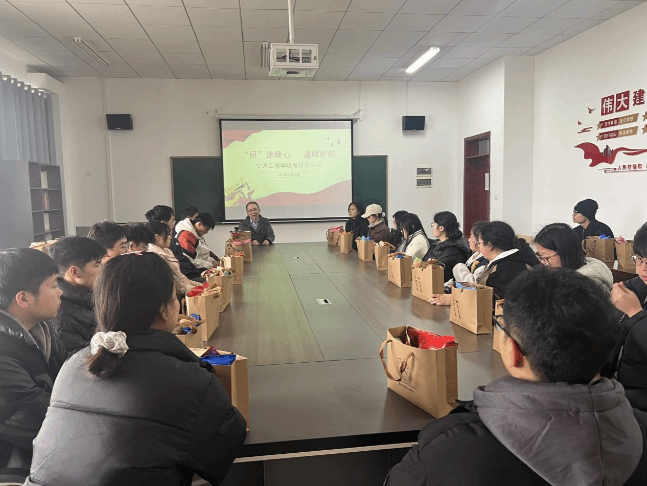 慰问会伊始,现场展示了我院历年成功上岸学长的考研院校、备考心得等相关信息,用真实案例为学子们树立榜样、传递信心。随后,两段学长考研祝福暖心视频温情播放,学长们分享备考经验、送上真挚期许,字里行间的鼓励让在场学子倍感温暖。最受期待的慰问大礼包发放环节,学院为每位考研学子精心准备了包含暖宝宝、考研文具袋、零食大礼包的 “暖心套装”,从保暖、备考工具到能量补给全方位为学子护航,切实让学子感受到学院的关怀。