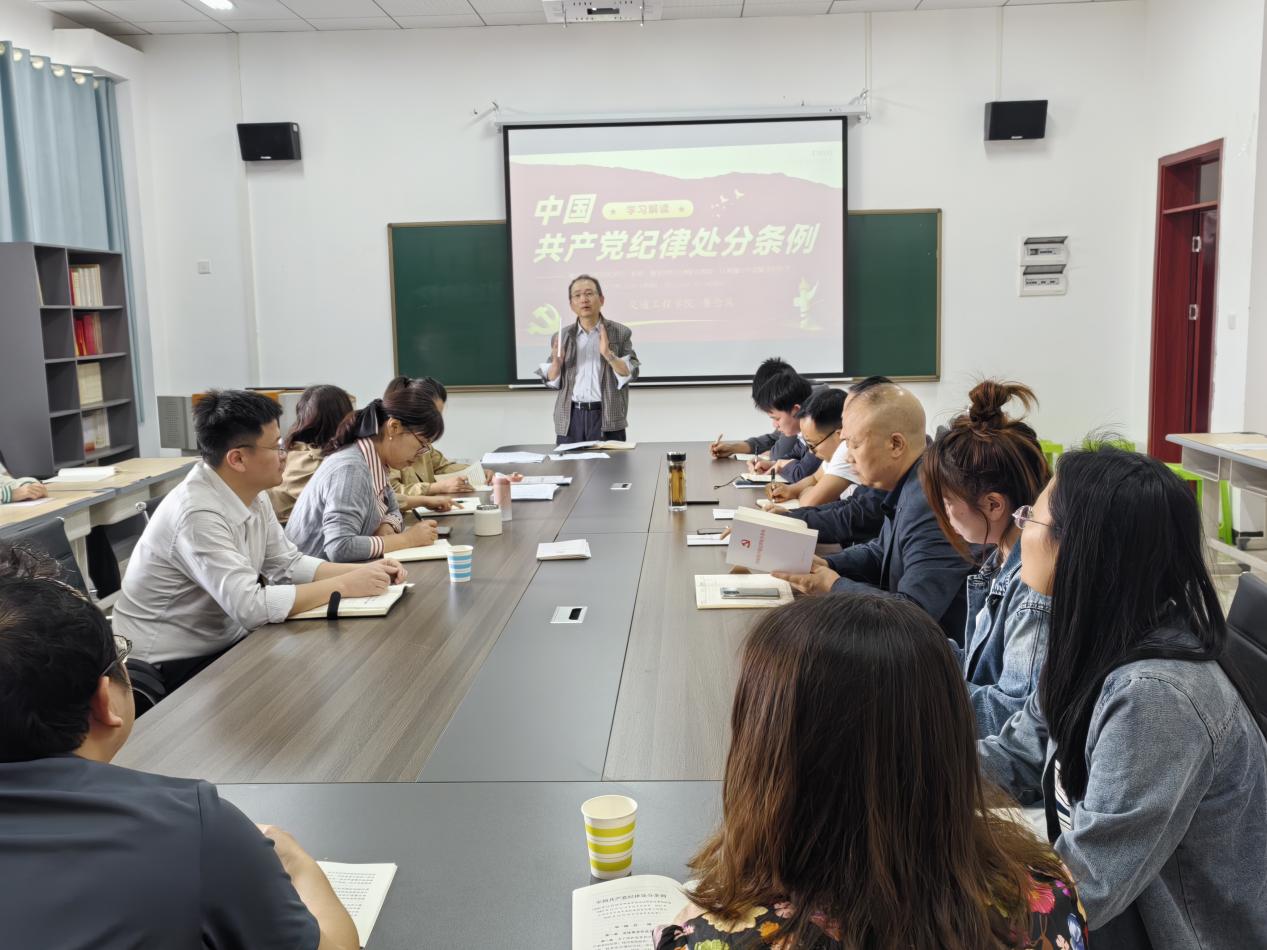 本网讯(交通工程学院 图/文 杨顺菊)为深入学习领会新修订的《中国共产党纪律处分条例》,推动党纪学习教育取得实实在在成效,引导党员干部明纪法、守底线。2024年5月10日下午,交通工程学院党总支书记黄念庆在敏行楼3516会议室以“中国共产党纪律处分条例学习解读”为主题讲授了党纪学习教育专题党课,交通工程学院全体教师党员和学生党员代表聆听了党课。