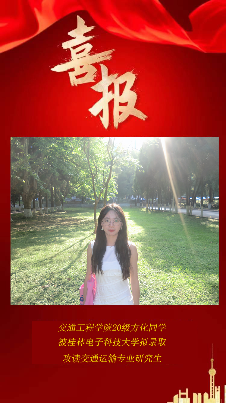 交通工程学院2024届考研学子捷报传来,在2023年全国硕士研究生招生考试中,交通203班方化同学拟录取桂林电子科技大学,特发喜报以示祝贺!