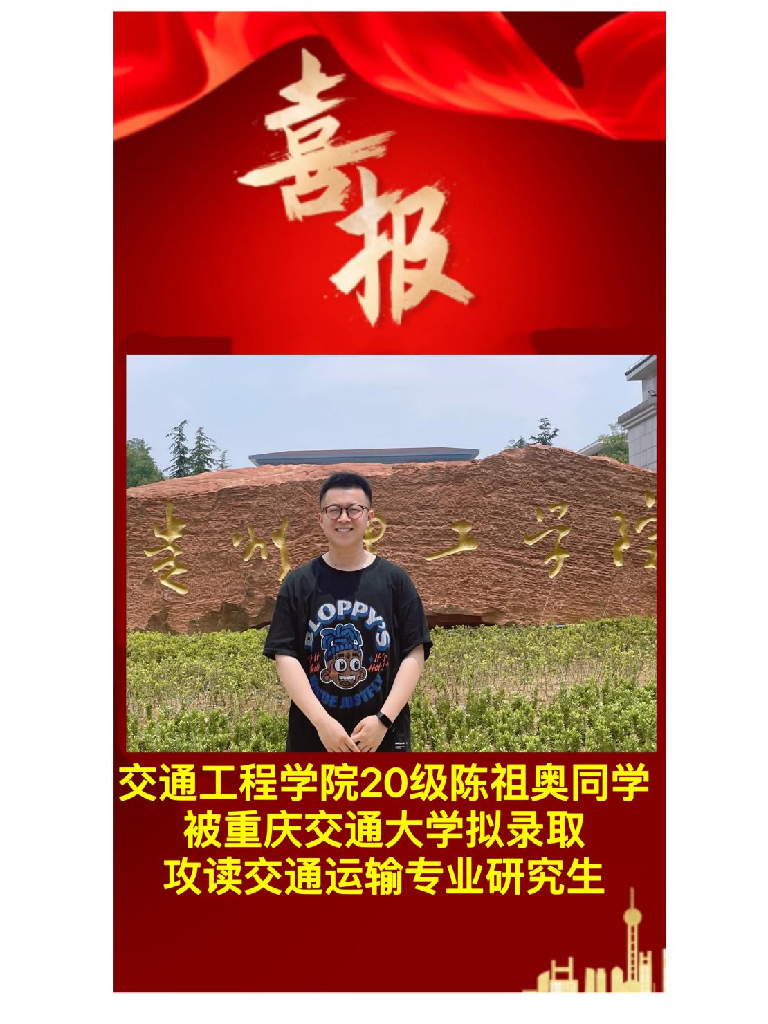 交通工程学院2024届考研学子捷报传来,在2024年全国硕士研究生招生考试中,交通203班陈祖奥同学拟录取重庆交通大学,特发喜报以示祝贺!