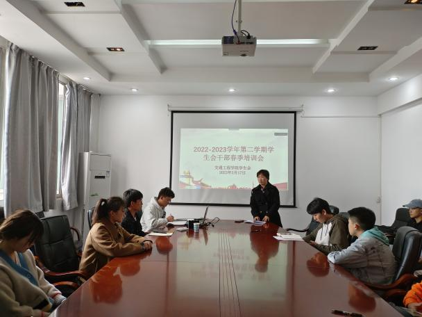 本网讯(交通工程学院 图文/沈冬冬)为进一步提高学生会干部积极为学生服务的使命感和责任心,强化担当作为,更有效地为广大同学服好务,2023年3月17日中午,在团总支书记苏利荣老师的指导下,交通工程学院学生会召开2022-2023学年第二学期学生干部春季培训会,学生会副主席刘浪主持会议,贵安校区部分学生干部同时采用腾讯会议进行。