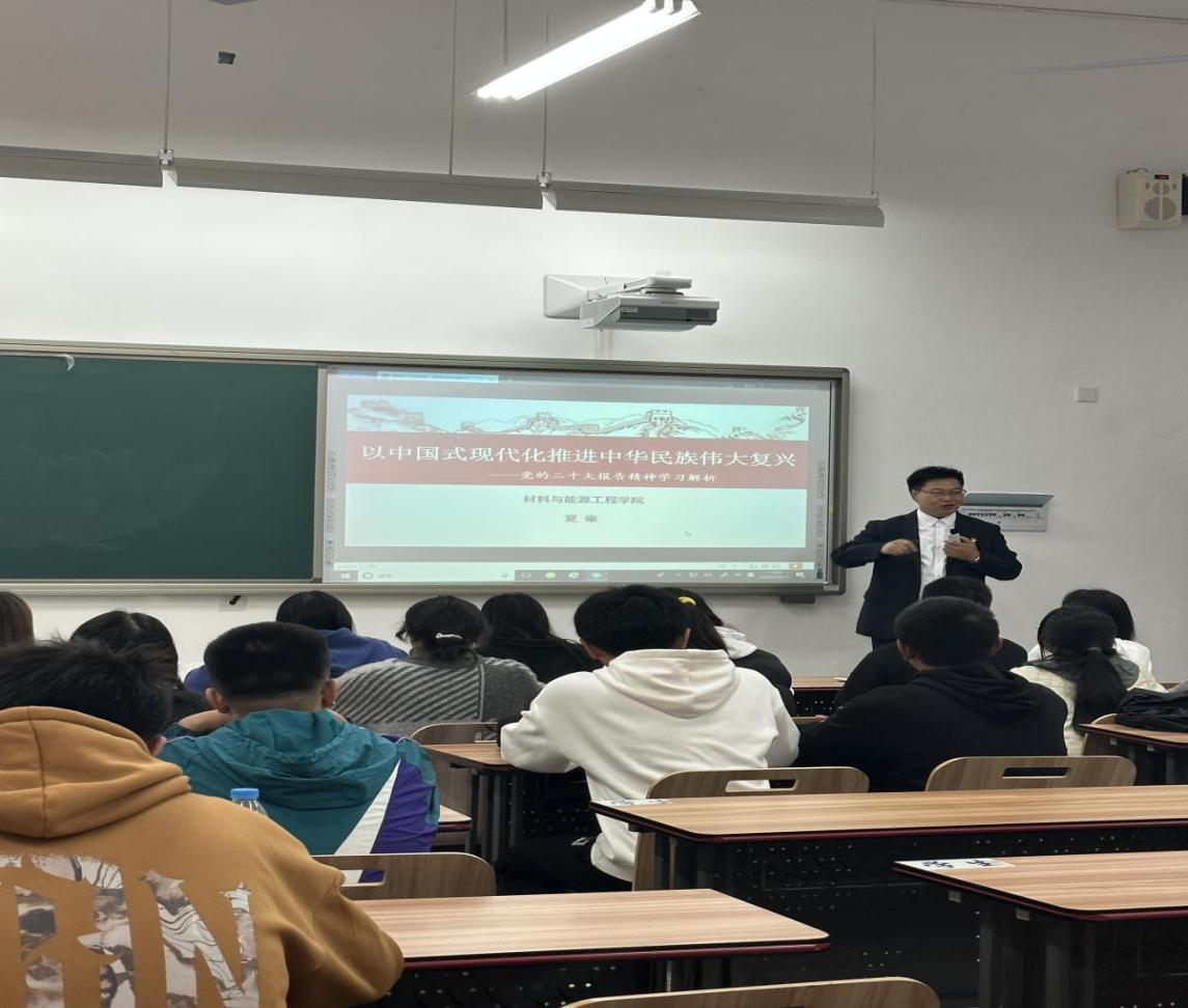 (本网讯 交通工程学院 图文/王梦沅)为全面学习贯彻党的二十大精神,深入学习习近平新时代中国特色社会主义思想,2023年10月13日下午一点在开物楼116教室,由材料与能源工程学院、交通工程学院、外国语学院和人工智能与电气工程学院共同举办的院级第二期大学生骨干班理论培训开讲,材料与能源工程学院党总支副书记夏雍以《以中国式现代化全面推进中华民族伟大复兴》为题进行理论宣讲,四学院学生骨干40多人聆听。