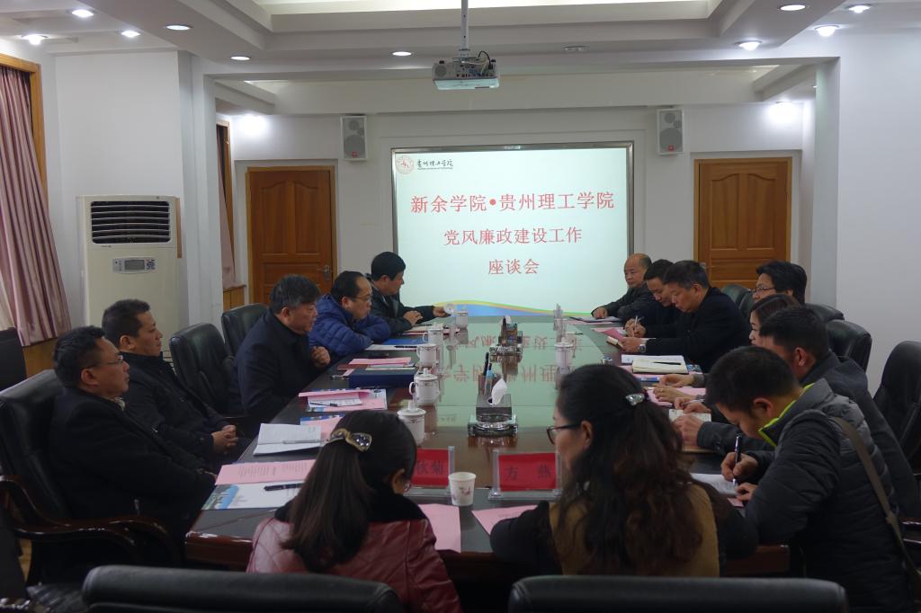 11月29日,江西新余学院党委委员、纪委书记简少华率领新余学院监审处、财务处、后勤管理与资产管理处、体育学院相关人员组成的考察团来我校考察。下午三点在行政楼五楼第一会议室召开“新余学院·贵州理工学院党风廉政建设工作座谈会”,会议由我校党委委员、纪委书记苏向东主持。参加会议的还有我校纪委监察室、宣传部、学生工作部、审计处、后勤处、计财处、国资处、体教部的相关人员。
