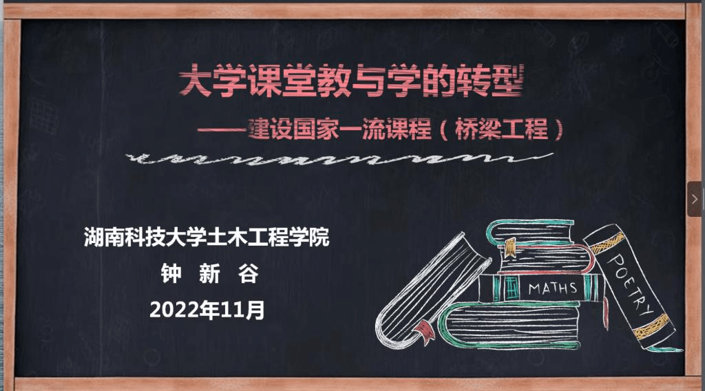 湖南科技大学钟新谷教授以“大学课堂教与学的转型——建设国家一流课程(桥梁工程)”为主题,围绕传统课程的“痛点”、建设一流课程,破解痛点有“良方”、如何使“课程优起来”、如何使“教师强起来”、如何使“考核严起来”、课程思政如盐在水等方面对课程建设进行讲解。