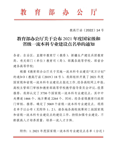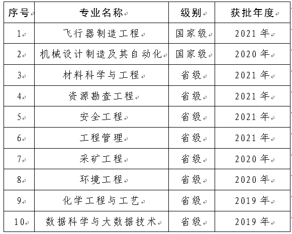 (本网讯 苏镜萍)根据《教育部办公厅关于公布2021年度国家级和省级一流本科专业建设点名单的通知》(教高厅函〔2022〕14号)精神,教育部办公厅公布了2021年度国家级和省级一流本科专业建设点,我校飞行器制造工程专业获批国家级一流本科专业建设点,材料科学与工程、资源勘查工程、安全工程、工程管理4个专业获批省级一流本科专业建设点。截止目前,我校共有2个专业入选国家级一流本科专业建设点,8个专业入选省级一流本科专业建设点。