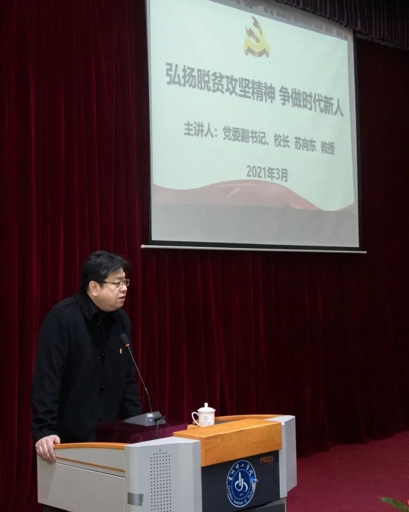 党委副书记、校长苏向东以《弘扬脱贫攻坚精神争做时代新人》为题开讲第一课,从扶贫历史和亲身体验两个角度,围绕彪炳史册的伟大奇迹、脱贫攻坚精神的科学内涵、以脱贫攻坚精神锻造时代新人三个方面和蔡家关校区的同学们进行了分享。