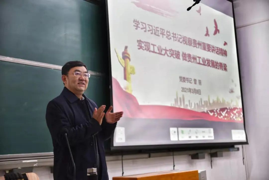 党委书记曾羽以《学习习近平总书记视察贵州重要讲话精神实现工业大突破做贵州工业发展的脊梁》为题开讲第一课,围绕牢记嘱托从深入学习贯彻习近平总书记视察贵州重要讲话精神、学习领会省委十二届八次全会精神、建设新型工业化的时代命题、做贵州工业发展脊梁的历史使命四个方面和贵安校区的同学们进行了分享。