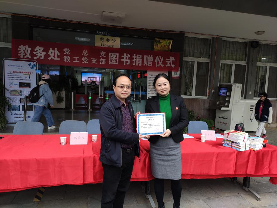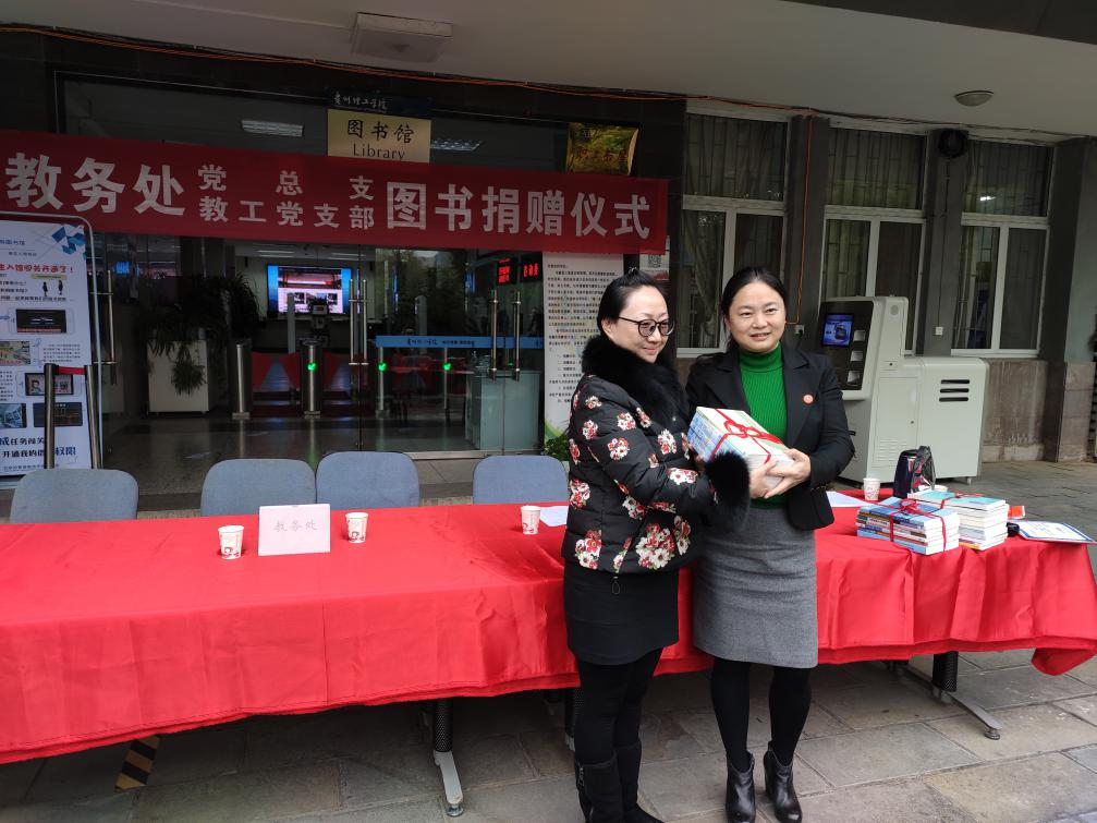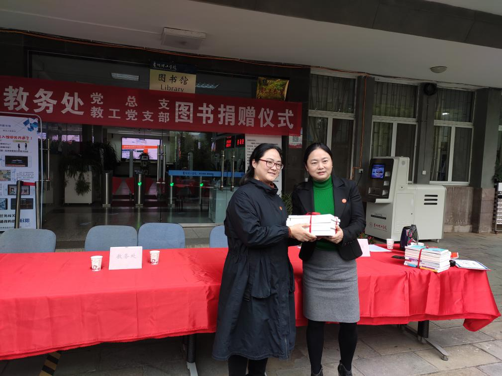 (本网讯 教务处 罗敏)11月4日下午,教务处党总支、教工党支部在蔡家关图书馆举行图书捐赠仪式,校领导张开智出席仪式,图书馆全体工作人员及教务处党总支、教工党支部相关人员参加图书捐赠仪式。