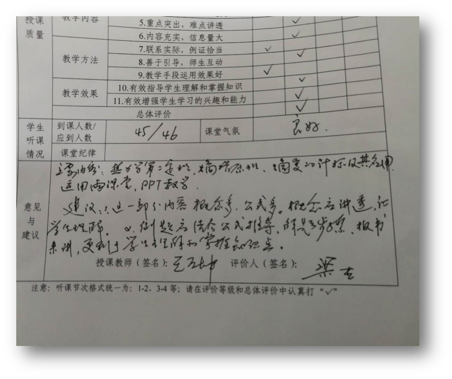梁杰来到一教204王万坤老师的《材料物理化学》课堂,通过听课、查阅教学文件、询问使用“雨课堂”情况等来观察学生课堂状况和教师教学组织情况。他认为,王老师备课充分、教学文件齐全、教学进度正常,能熟练使用雨课堂等现代化教学手段。同时,他建议任课教师根据《材料物理化学》课程概念多、公式多的特点,结合学生实际情况,注重用板书进行公式推导,把概念讲透,结合例题对公式进行推导,以利于学生理解和掌握知识点。