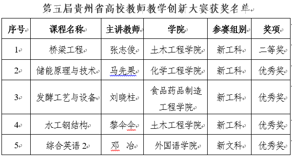 本网讯(教务处)近日,第五届贵州省高校教师教学创新大赛获奖名单正式公布,我校土木工程学院张志俊等5位参赛教师团队在大赛中再创佳绩,分别荣获新工科组二等奖1项、优秀奖3项,新文科组优秀奖1项。