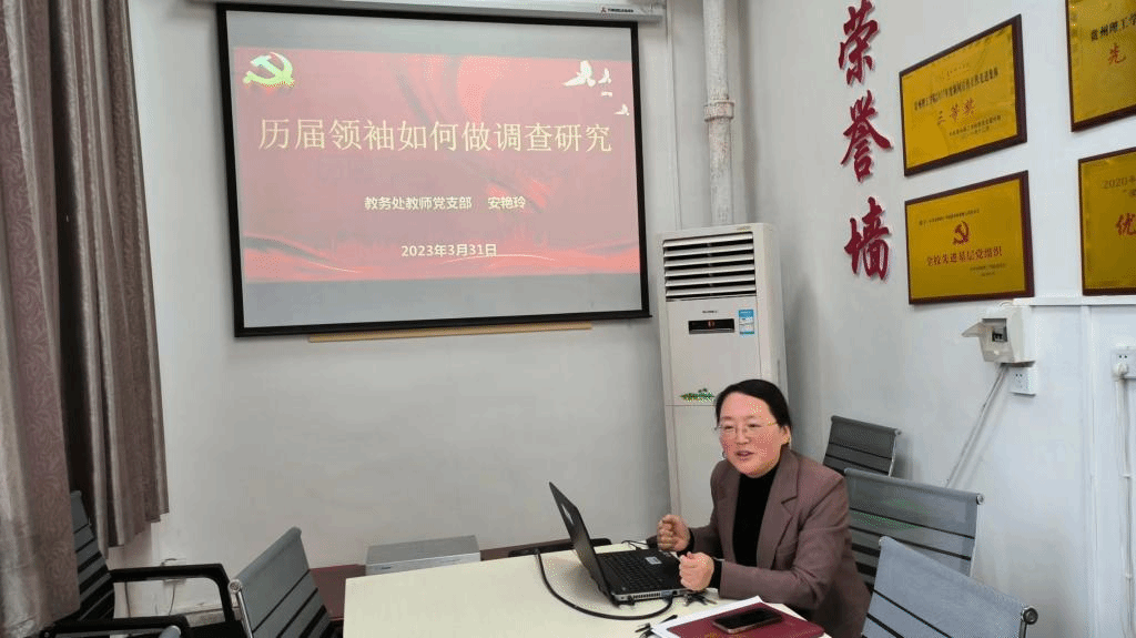 本网讯(教务处 罗敏)为扎实基本功,提升工作本领,更好地推动调查研究走深走实,2023年3月31日,教务处教师党支部书记安艳玲以“历届领袖如何做调查研究”为主题给支部全体党员上了一堂生动、深刻的党课。