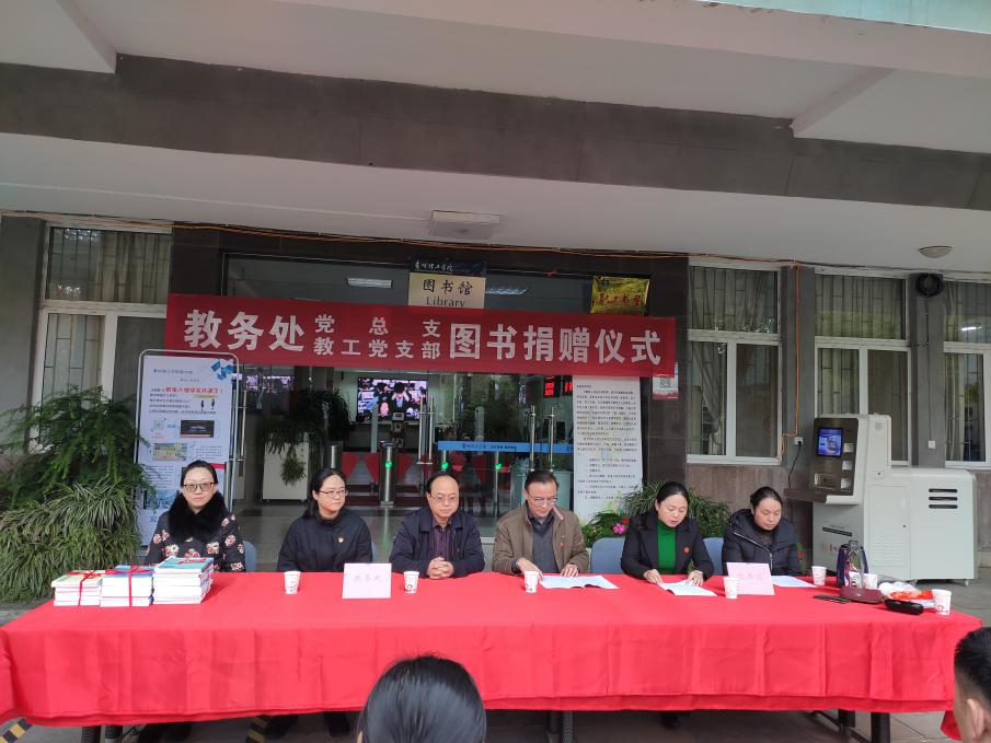 (本网讯 罗敏)11月4日下午,教务处党总支、教工党支部在蔡家关图书馆举行图书捐赠仪式,校领导张开智出席仪式,图书馆全体工作人员及教务处党总支、教工党支部相关人员参加图书捐赠仪式。
