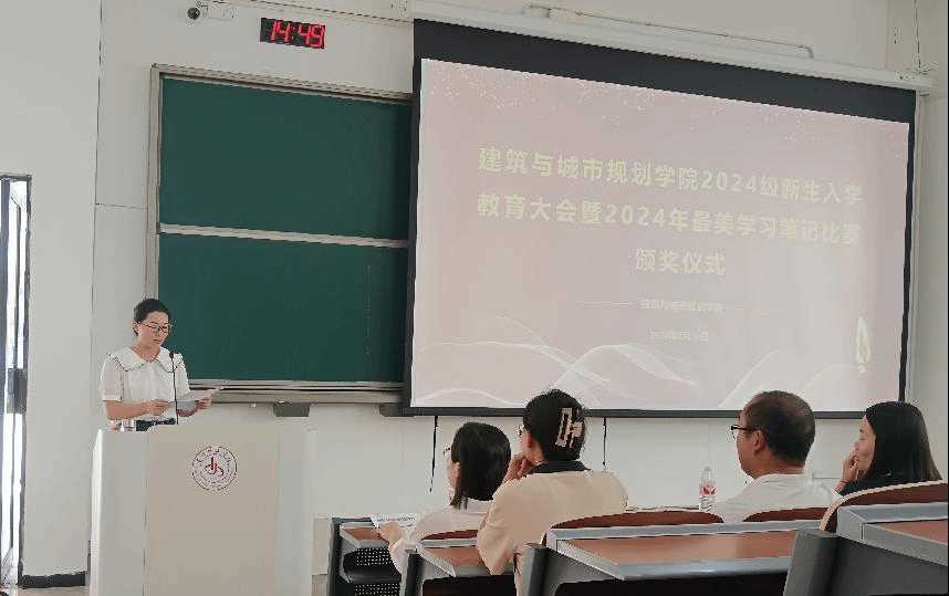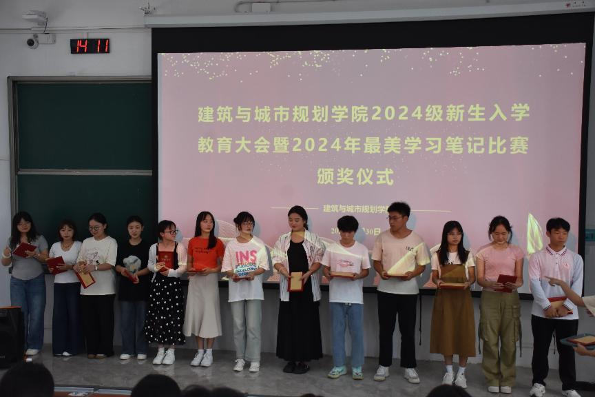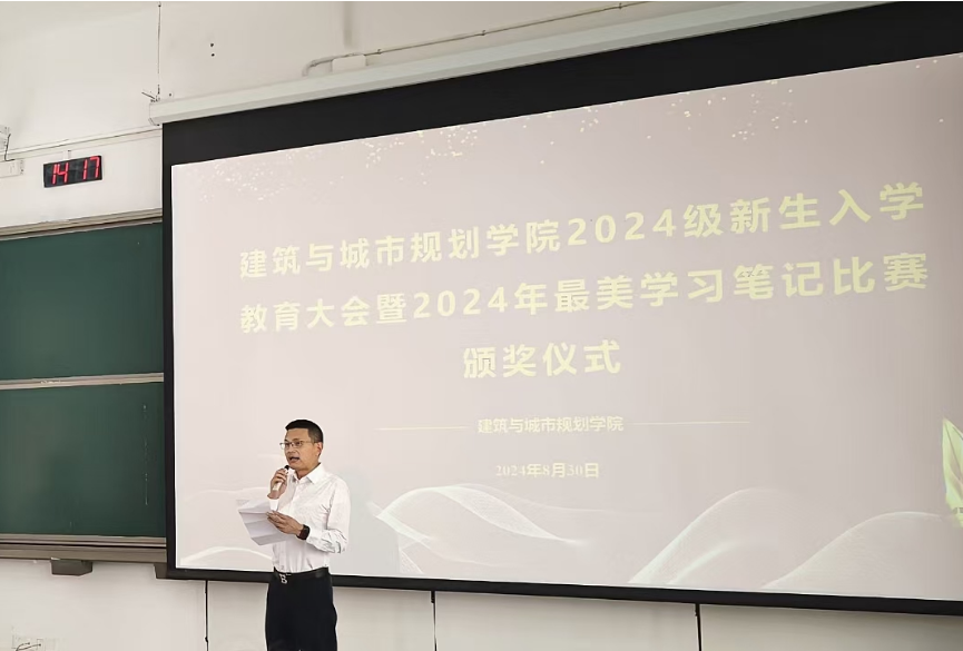 2024 年 8 月 30 日,建筑与城市规划学院在开物楼G1110教师举行2024 届新生入学教育大会暨2024年最美学习笔记比赛颁奖仪式。学院党总支书记袁小松、院长黄娅、建筑学专业负责人王东、人文地理与城乡规划专业教研室主任张英佳、环境设计专业副主任李晓玲、学生科副科长(团总支副书记)周红韵、24级辅导员杨小岚出席,2024级全体新生及最美笔记获奖学生参加活动。并特邀广东亿尚智能家居制造有限公司董事长周可全先生莅临现场。