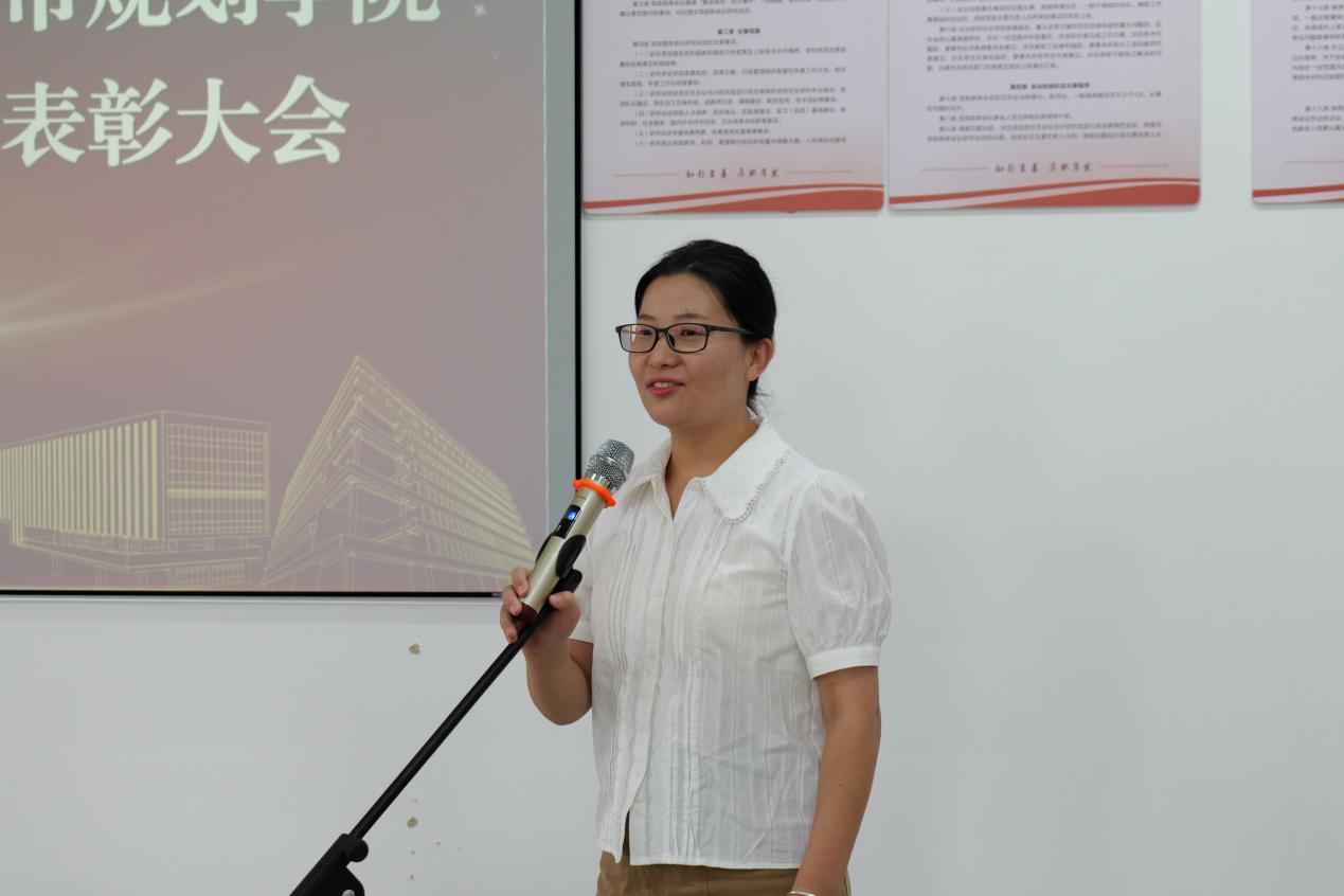 会议由学院学生科副科长、团总支副书记周红韵主持。党总支书记袁小松宣读《关于表彰建筑与城市规划学院2024年优秀教师、优秀教育工作者的决定》表彰文件。分别来自人文地理与城乡规划、环境设计、建筑学三个专业教研室的杨涛、于鑫、李晓玲、袁意斯扬、王东、沈逸菲等6位同志被评为“2024年建筑与城市规划学院优秀教师”;办公室主任申偲同志被评为“2024年建筑与城市规划学院优秀教育工作者”。