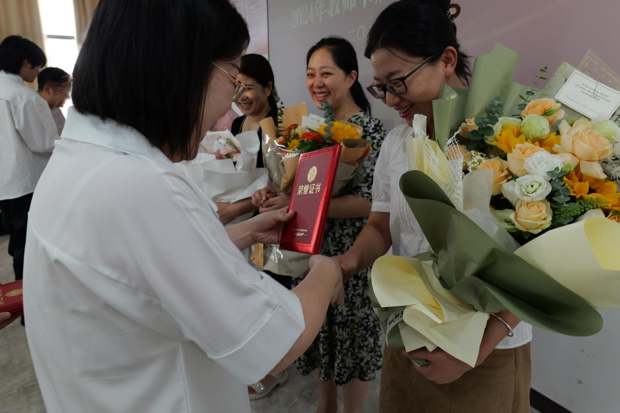 在明媚欢快的《步步高》音乐中,学生代表为获奖老师敬献鲜花。一束束鲜花不仅代表着学生们的敬意和感激,更是对老师们辛勤耕耘的真挚礼赞。在大家的热烈掌声中,党总支书记袁小松、院长黄娅为获奖教师颁发荣誉证书。