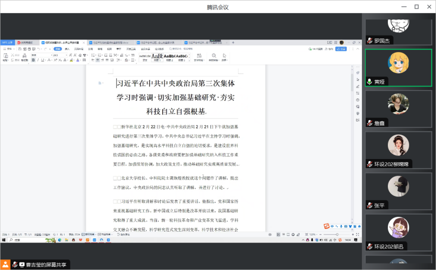 党总支副书记黄娅同志领学习近平总书记关于“加强基础研究,实现高水平科技自立自强”的重要讲话精神。通过学习,党员同志们充分认识到在党中央坚强领导下,我国科技实力正在从量的积累迈向质的飞跃、从点的突破迈向系统能力提升,科技创新取得新的历史性成就。