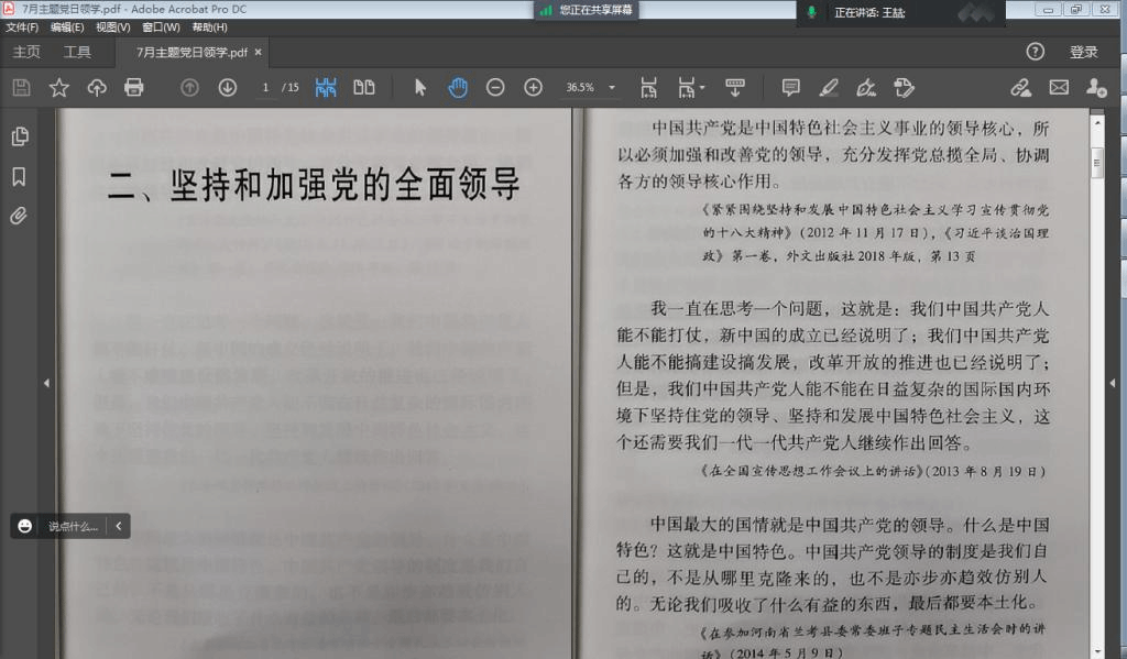 王喆领学了《习近平新时代中国特色社会主义思想专题摘编》第二专题“坚持和加强党的全面领导”部分内容,从中国共产党领导是中国特色社会主义最本质的特征,“两个维护”是党的最高政治原则和根本政治规矩,不断提高政治判断力、政治领悟力、政治执行力等方面,深入学习了习近平总书记关于坚持和加强党的全面领导重要论述。