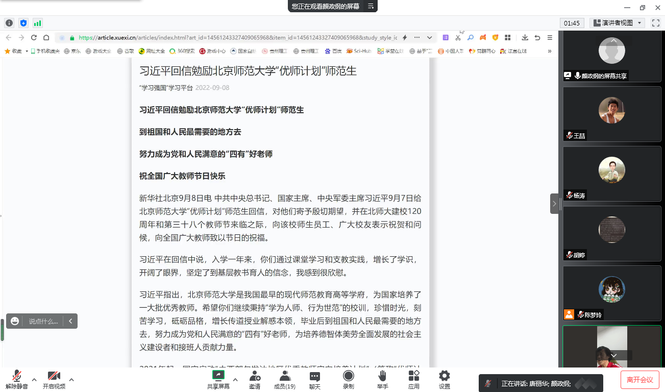 党总支书记唐丽华同志领学了习近平给北京师范大学“优师计划”师范生的回信。她指出,全体党员要领会习近平总书记重要讲话精神,党员同志在带头落实的同时,积极引导全院教师,砥砺品格,做真正“四有”好老师,做为人师表的“大先生”。