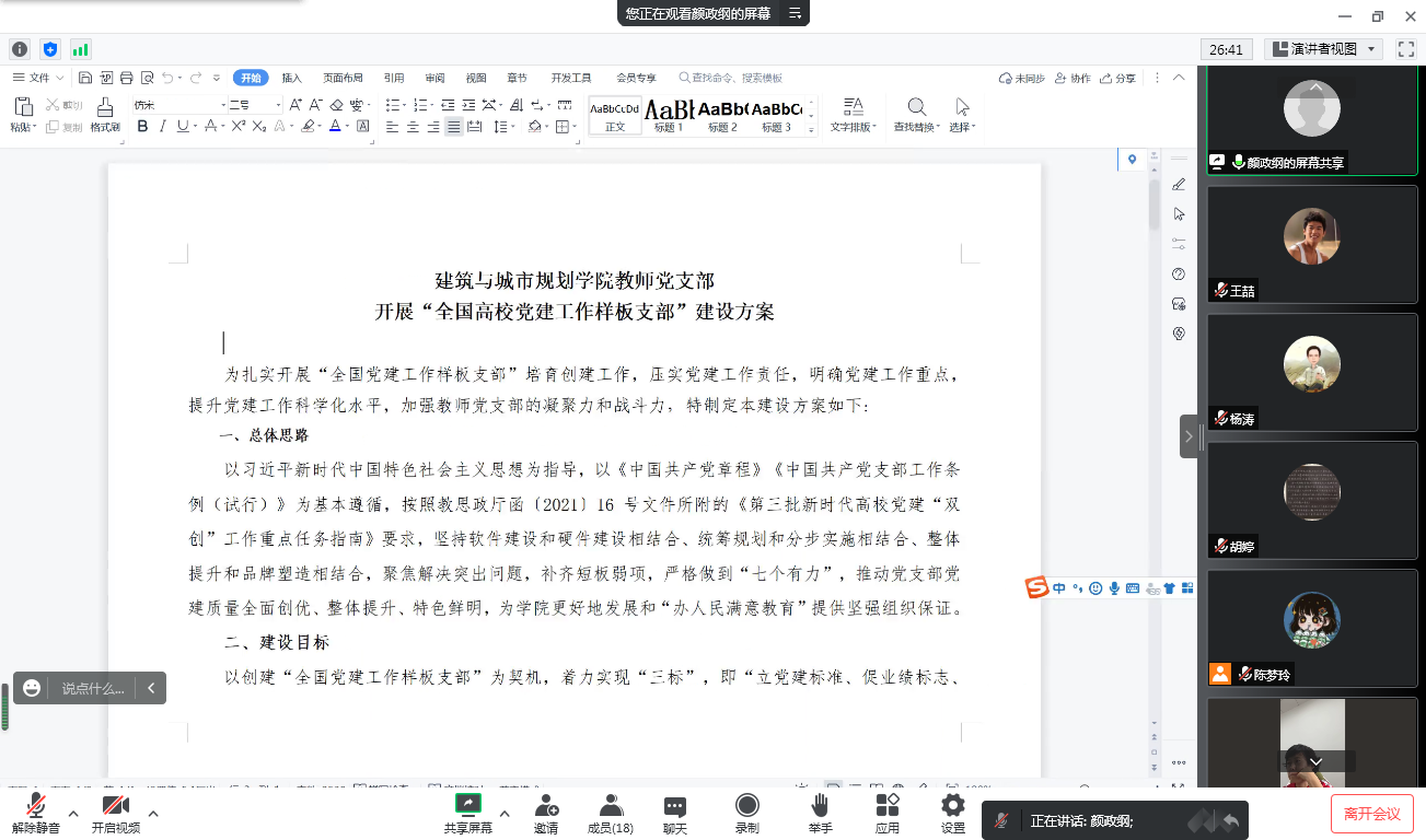 本网讯(建规学院 王喆)2022年9月23日,建筑与城市规划学院教师党支部在腾讯会议平台召开了党员大会,大会由教师党支部书记颜政纲同志主持,支部全体党员参加。