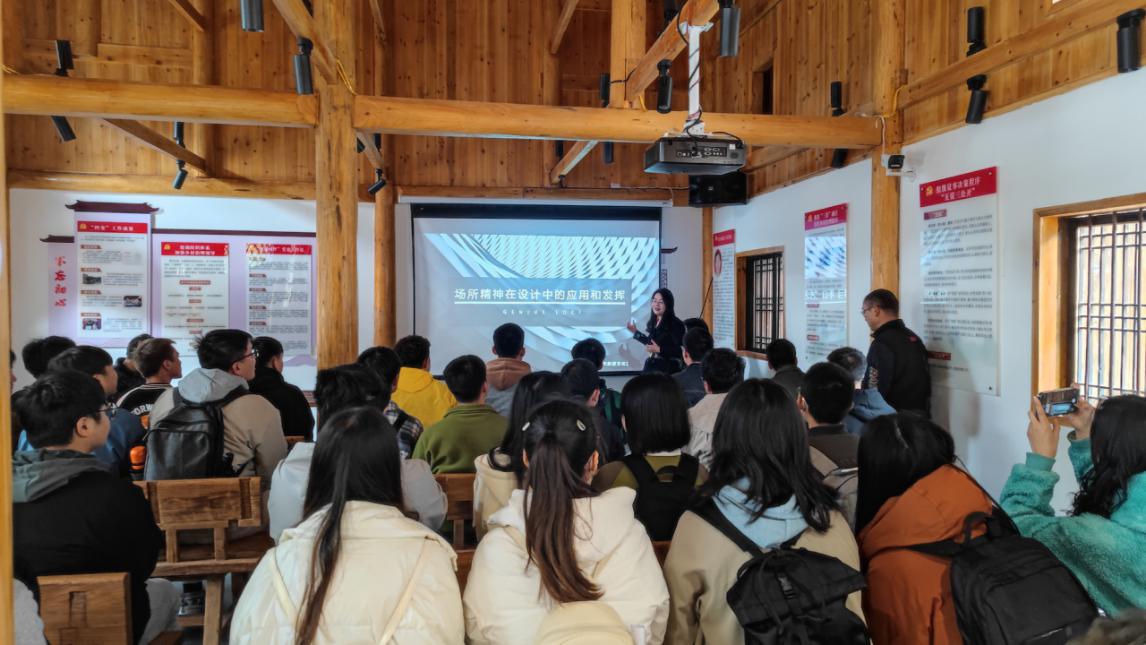 场所精神在设计中的应用是在乡村文化大礼堂进行讲授的,刘琳总设计师专门为学生讲授了什么是场所精神,强调好的建筑在于给人们美好的生命体验和满足人们的情感价值需求。通过在场所中的学习,同学们深化增强了对建筑美学的认知。在提问环节,同学们踊跃回答,积极与刘总设计师互动,进一步激发了同学们对建筑学专业的兴趣。
