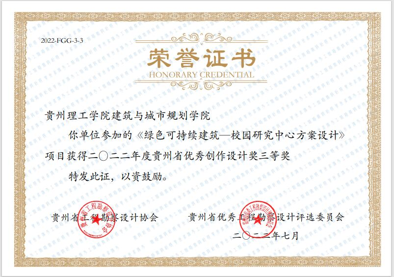 在师生的共同努力下,我院建筑学专业张璇、沈逸菲老师的《绿色可持续建筑-校园研究中心方案设计》荣获2022年度贵州省优秀创作设计奖三等奖的成绩。